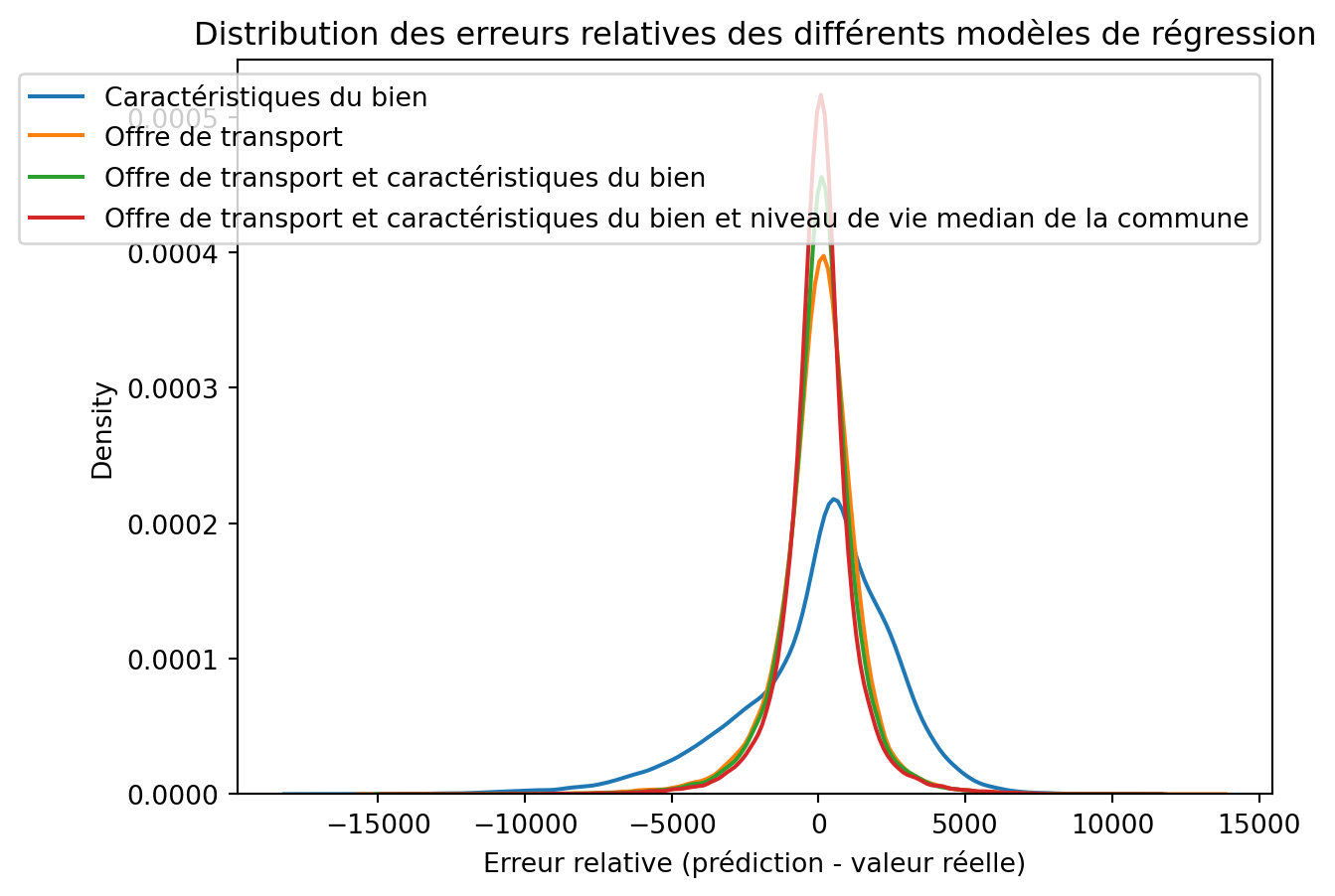 - Les erreurs diminuent de manière significative à mesure que l’on enrichit le modèle, comme l’illustre la baisse continue du MAE. Celui-ci passe de 2 003 pour le modèle basé uniquement sur les caractéristiques du bien à 849 pour le modèle complet. Cela signifie qu’en moyenne, l’erreur absolue de prédiction est divisée par plus de deux lorsque l’on intègre l’offre de transport et le revenu médian de la commune.